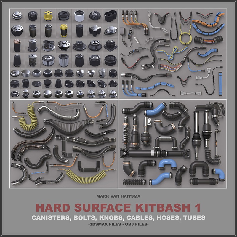 This is a 360+ piece set of canisters, bolts, knobs, cables, hoses and tubes (all of my current libraries combined) ready to be used for high poly additions to your models/concepts.