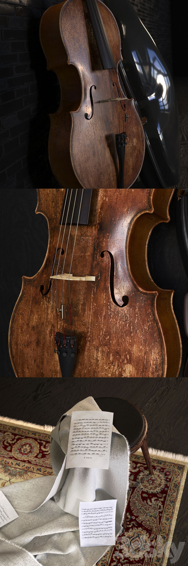 音乐集。 该套件包括一个模型大提琴,该大提琴是在我家中基于真实乐器制作的。 纹理高分辨率的木材。 模型很详细。 修改器堆栈没有最小化:低多边形:101,097多边形高多边形版本:199,996多边形。 TurmoSmoth实例化。 重量为23.5 mb的文件。 V-Ray 3.2或更高版本。 地毯尺寸:182x180厘米。
