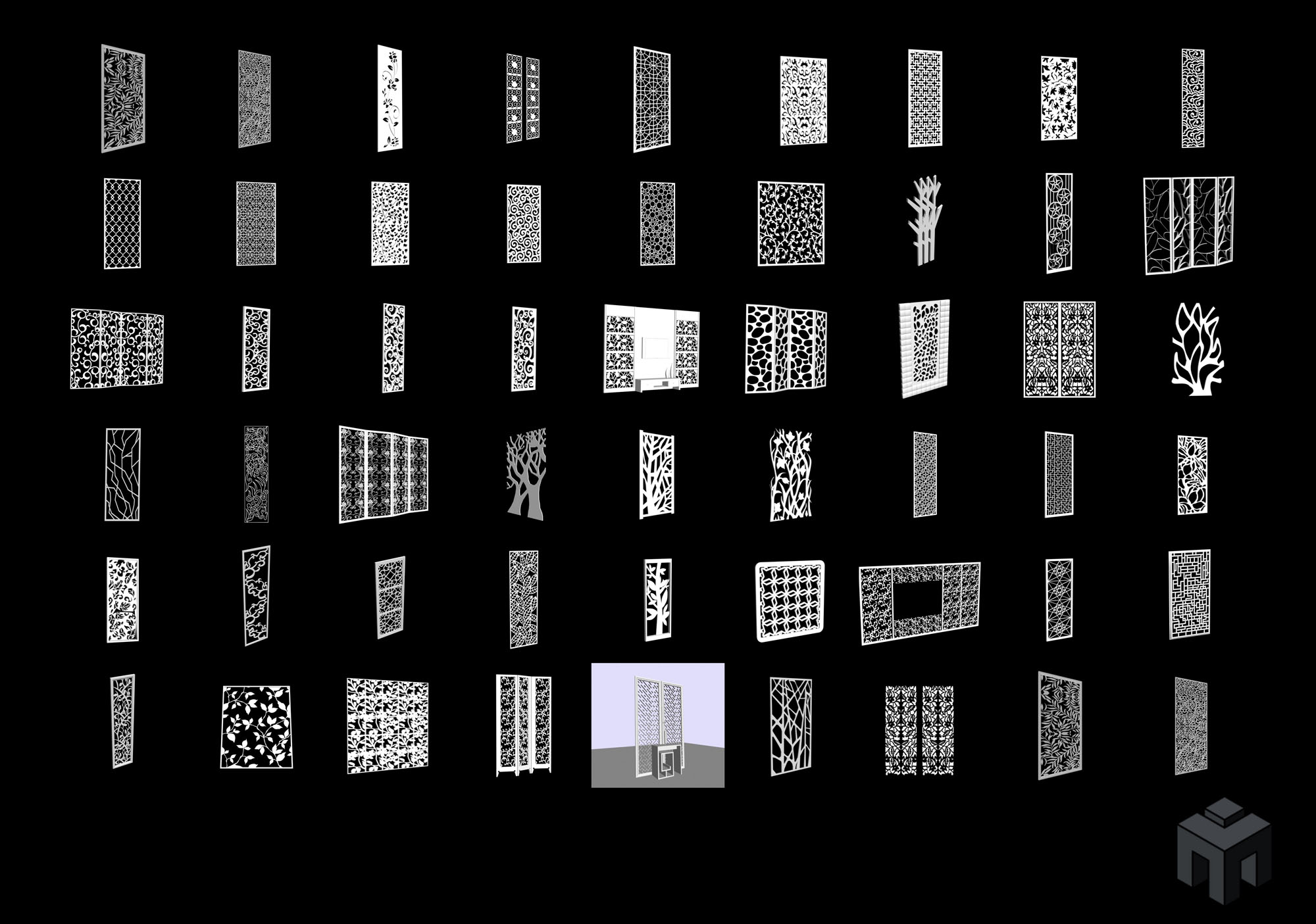 今天素材之家给大家分享的这款3D模型资源名称为:100款花纹叶子图案镂空隔断屏风3D模型,内容与隔断3D,屏风3D,3DMAX,3D模型,MAX相关,文件大小为25.37 MB,模型文件格式为MAX。
