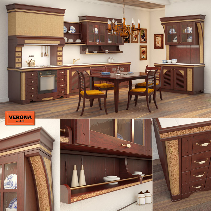 Kitchen Country,维罗纳·莫比利(Verona Mobili)乡村风格的工厂,雕饰。 桌面上铺有瓷砖。 外墙由郁金香木制成。 保留原始的装饰元素。 在2014vray档案中,2012vray,OBJ中