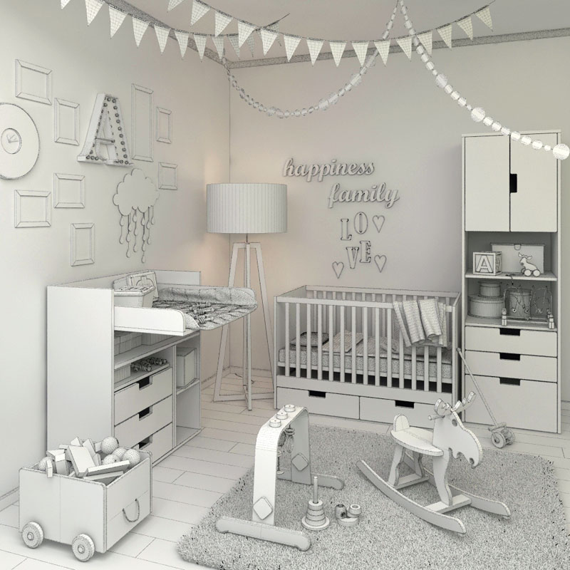 通用装饰套装,柔和色调,适合婴儿,适合男孩或女孩的房间。 该套件包含家具和装饰:-一张桌子,一个带3个抽屉的抽屉柜,他的更衣桌宜家STUVA STUVA 900h700h1020(h)毫米-宜家STUVA 1200h600mm的小床-宜家STUVA 600h500h1920(h)毫米的柜子-白色 +木材(桦木)-灯Nowodvorski ACROSS 600h600h1600(h)毫米-地毯1500h1500mm,Vray皮草-驼鹿-宜家摇摆EKORRE EKORRE 730h290h520(h)毫米-玩具的容器