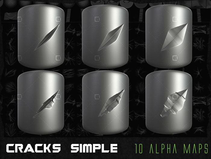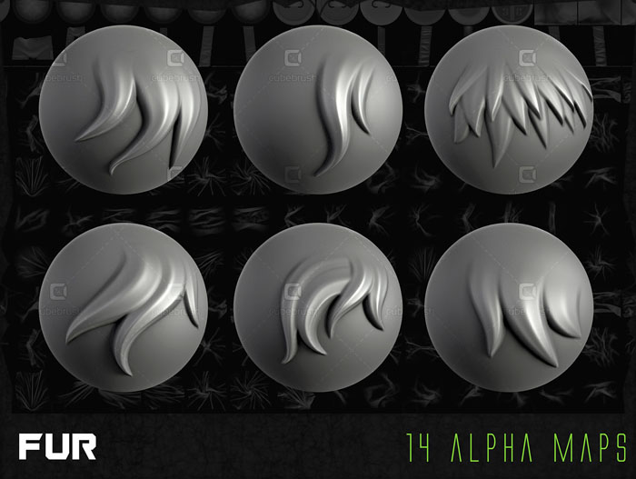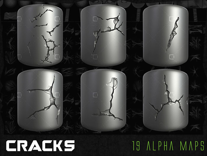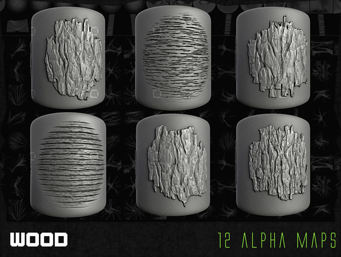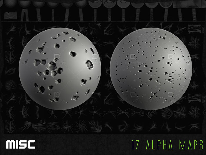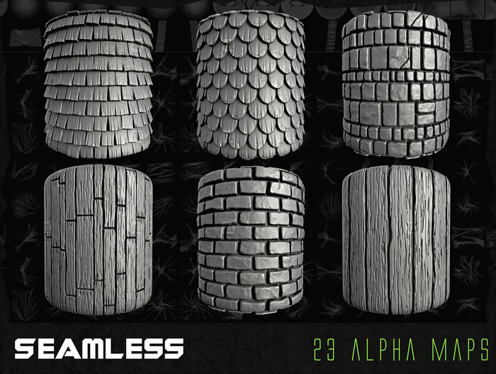 Alpha 贴图为 2048x2048 和 16 位深度。 包括 13 个 Zbrush 画笔。 前一包中的 5 个示例 Cloth alpha。