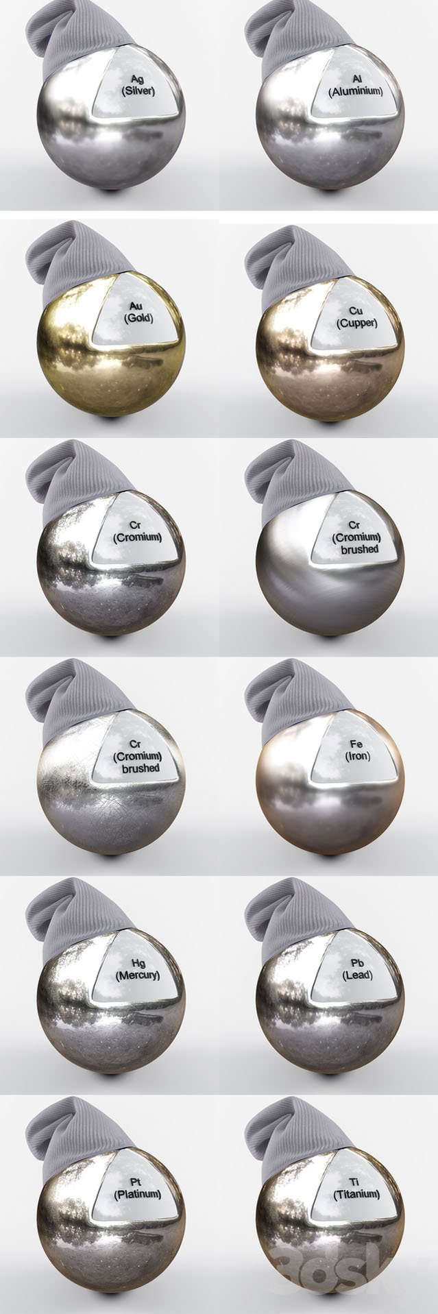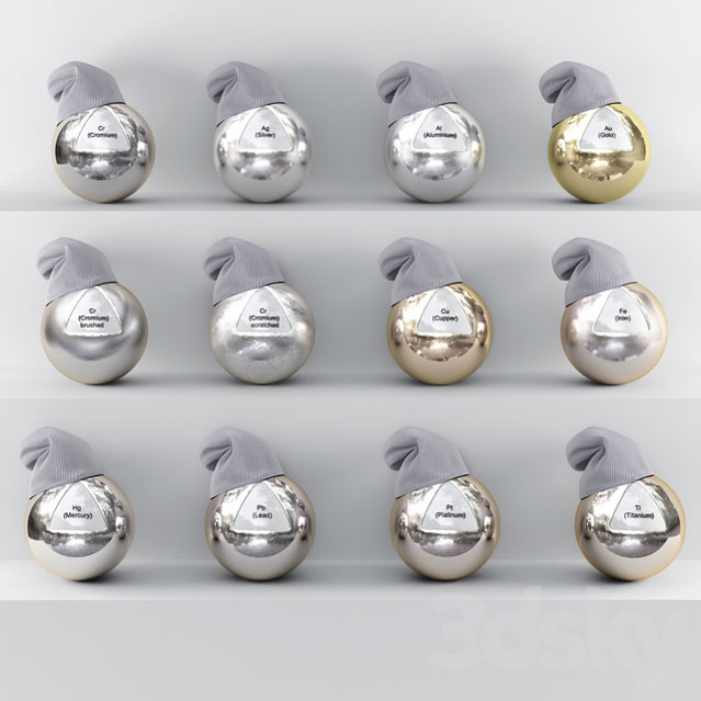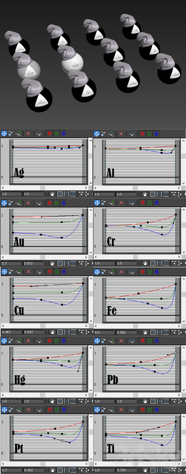 你好! 这是金属材料库。 带有球的存档场景,每个名称,化学元素的相关名称。 另外,在存档中,每种金属都有单独的预览。 适用于用户VRay SP1,SP2的材料,其中有BRDF Microfset GTR(GGX)。 对于较早版本的用户,需要查看BRDF,然后选择您喜欢的Blinn,Phong或Ward。 在视口中,材料看起来是黑色的。 颜色和阴影由金属制成,并且在“输出”下具有卡衰减,曲线RGB。 仅存档文件