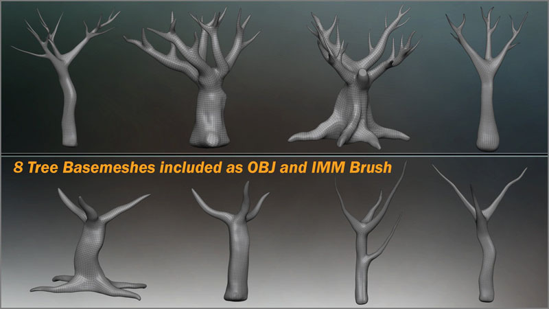 - 8 种不同形状的树的 Basemeshes:又高又瘦、宽、粗糙……有了这些基础,您可以快速开始制作一棵树或修改它们以自己制作。