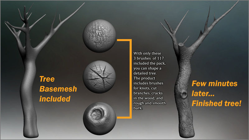 - 117 个 ZBrush 刷子,用于塑造树木和纹理树木:粗糙的树皮、光滑的树皮、裂缝、结节和切割的树枝。