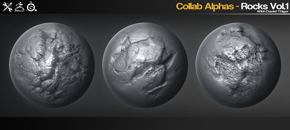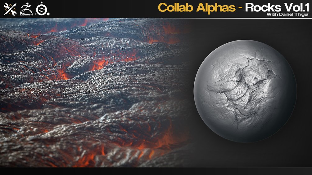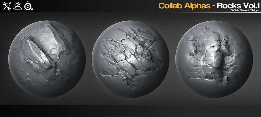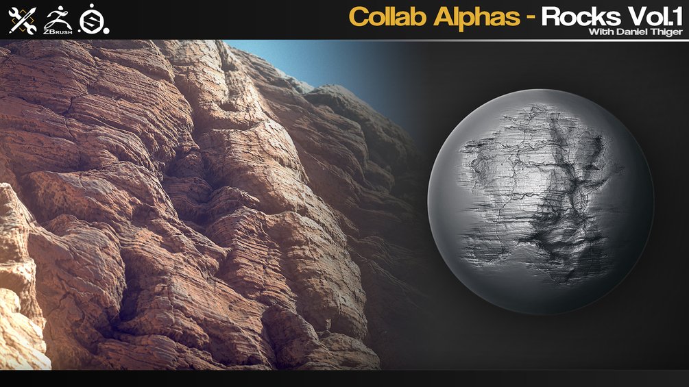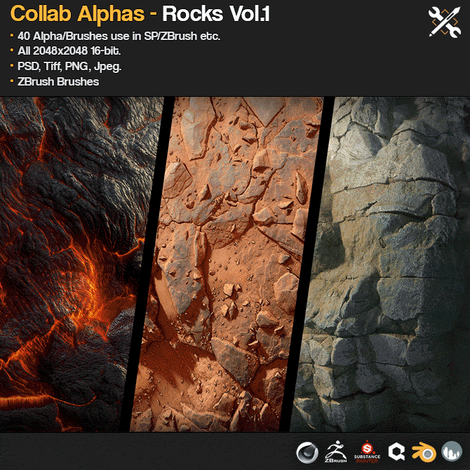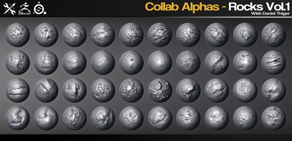 这是一组 40 个用于 ZBrush、Substance Painter、Quixel、Mixer、Blender 等的 Rock alphas/画笔。从 Daniel Thiger 创建的 Substance Designer 材料的精彩集合中生成和提炼。