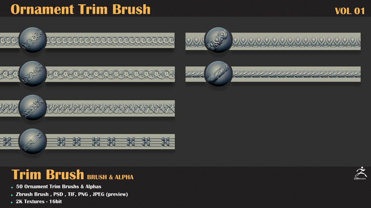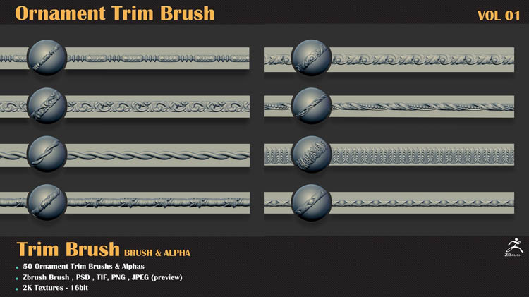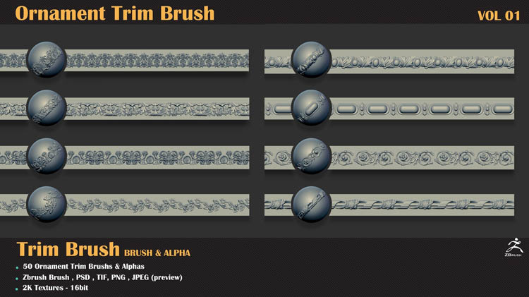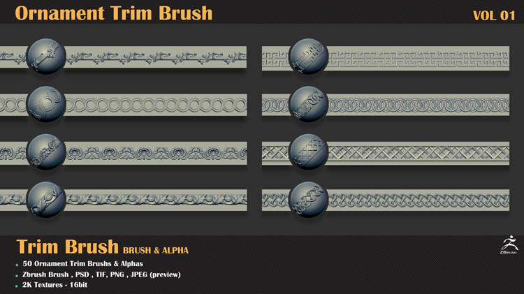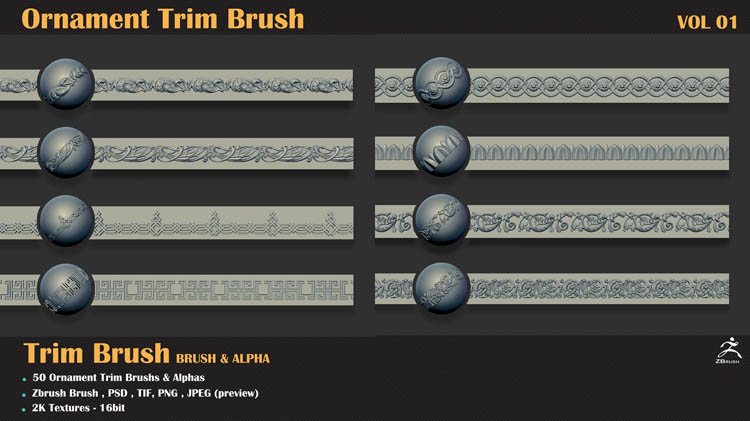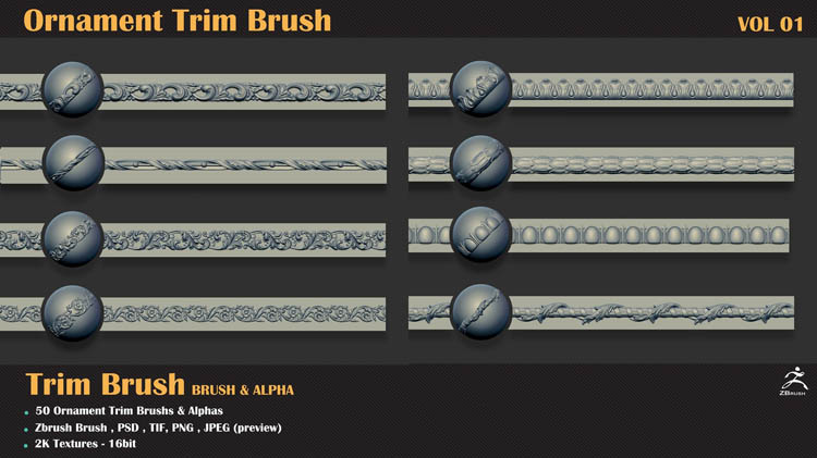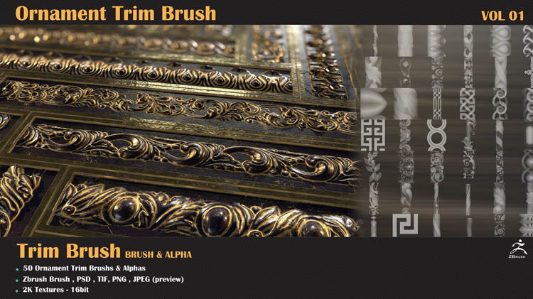 该产品包括50个用于Zbrush的装饰修剪笔刷和50个使用任何3d软件(3dmax,maya,blender,C4D等)的3dmodels。