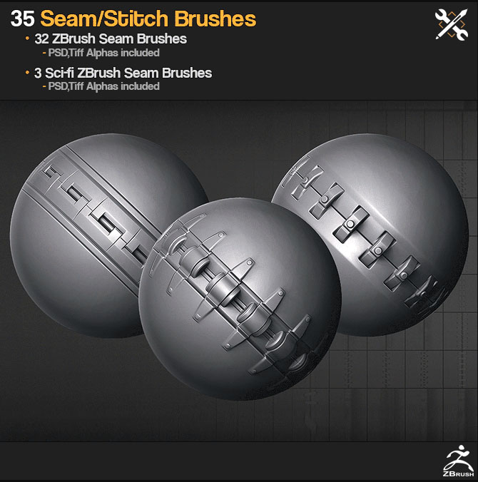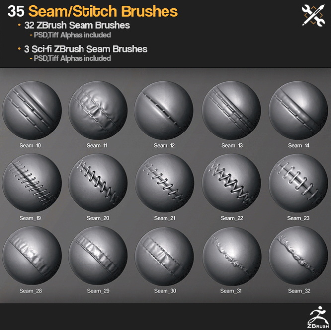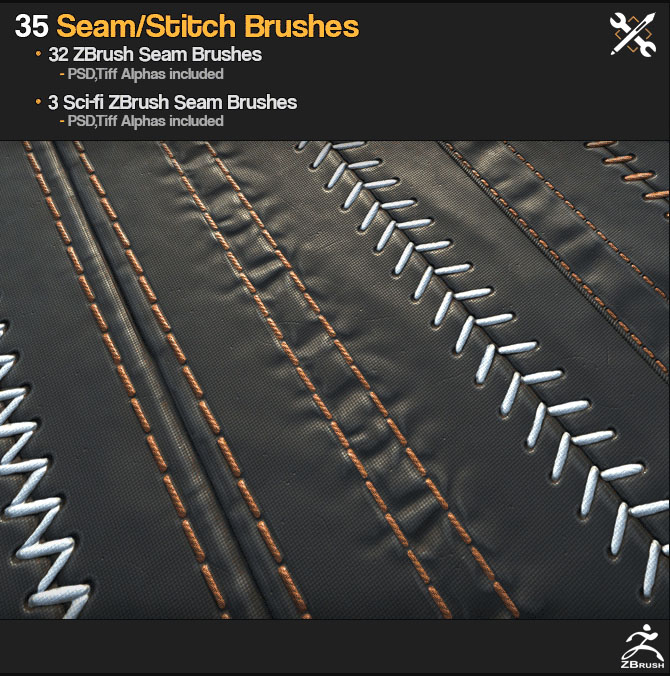 This is a Seam/Stitch alpha/brush set for ZBrush,35 brushes and Height/alpha maps, all 1024×1024 or 2048×2048 in Tiff, PSD and ZBrush Brushes.
