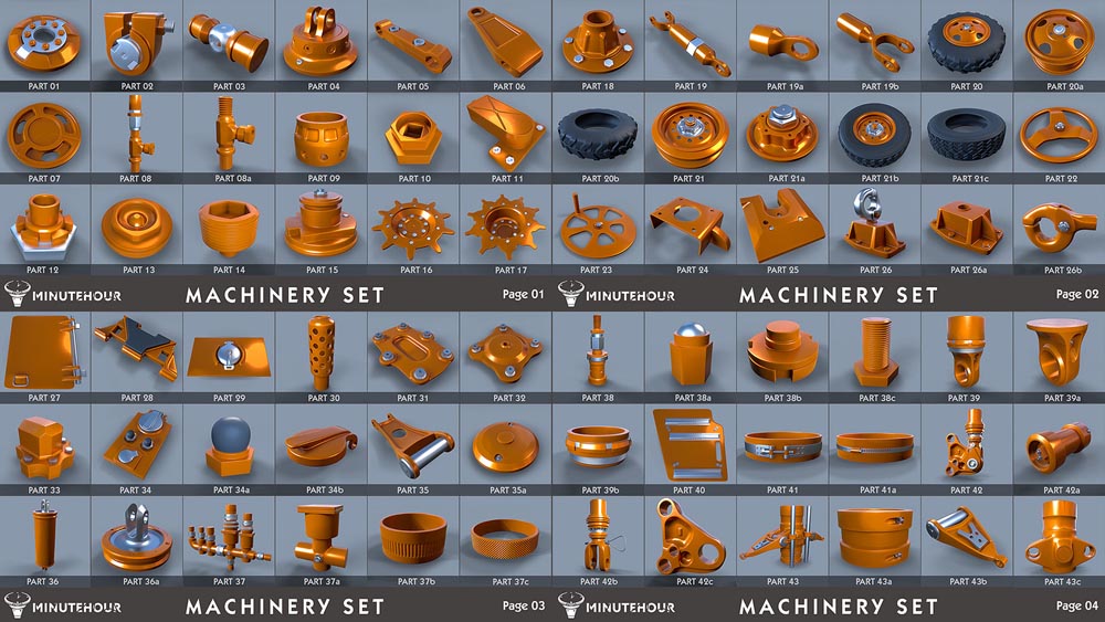 这是一套43件机器零件,高聚模型,以及Zbrush的IMM刷子
