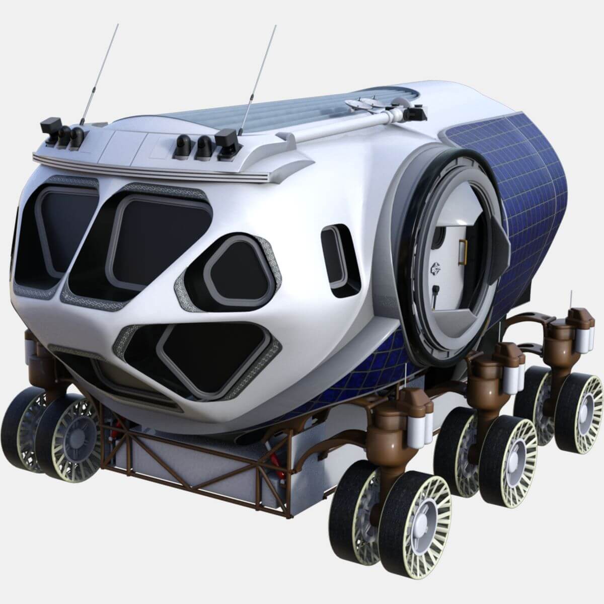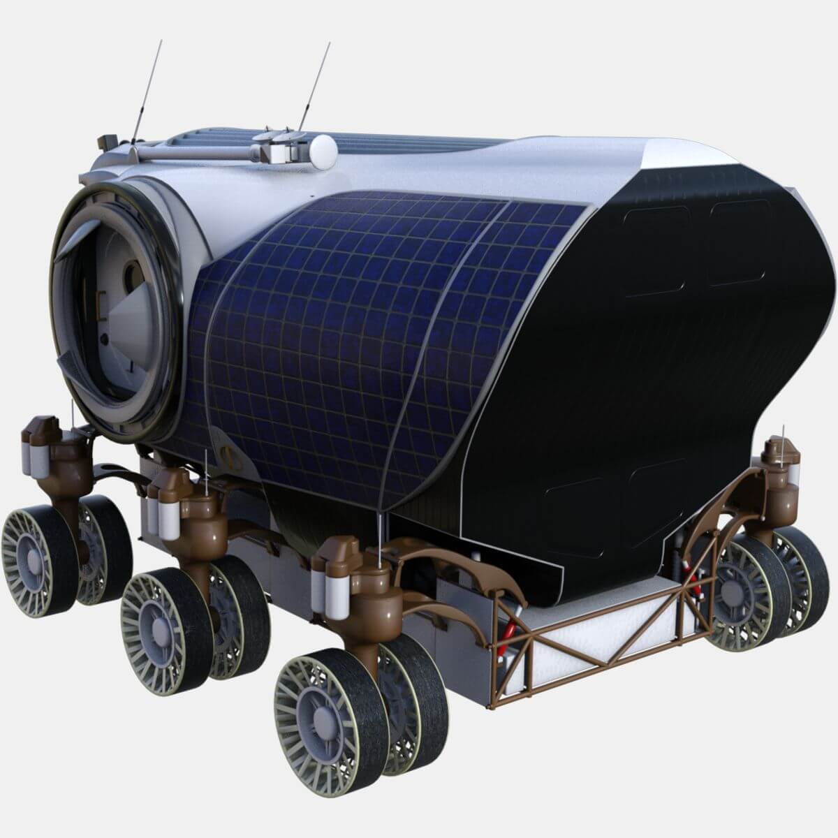 太空探索飞行器 (SEV) 概念设计为根据目的地灵活设计; 加压舱可用于太空任务和行星体的表面探索,包括近地小行星和火星。 SEV 的水面探索版将驾驶室安装在底盘上,车轮可以 360 度旋转,并以每小时 10 公里的速度向任何方向行驶。 它大约有一辆皮卡车的大小(有 12 个轮子),可以容纳两名宇航员长达 14 天,并配备睡眠和卫生设施。 同样,太空版的 SEV 将在飞行平台上拥有相同的加压舱; 它也将允许两名宇航员在现场停留 14 天。