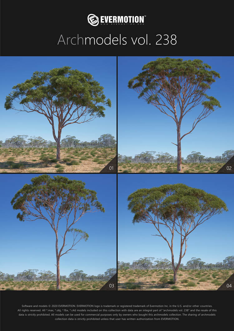 建筑模型卷 238包括用于建筑可视化的44个专业,高质量3d模型。 该收藏品配有澳大利亚和大洋洲生物群落典型的树木。 包括的物种:桉树,桔梗,短枝短柄蒲菜,阿拉伯树胶,枸杞,西洋参,南洋杉,拟南芥。 所有对象都可以在可视化中使用。