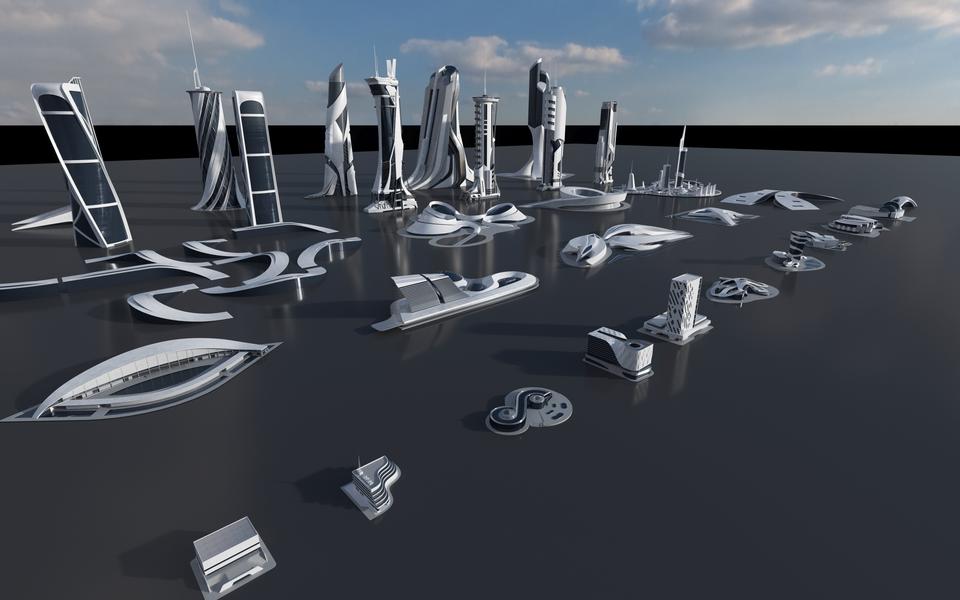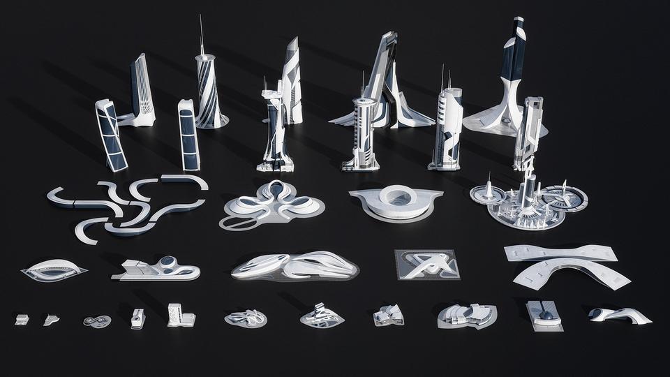从Zaha Hadid和Frank Gehry的灵感中汲取灵感,从建筑几何学中解放出来的具有创造性的结构来创造新的未来派城市。使用该工具包独特的多角度曲折形式和破碎的几何构想来想象先进的文明,其拥有巨大的体育场,光荣的博物馆或拥护自然建筑与自然和谐交融的环保意识社会。